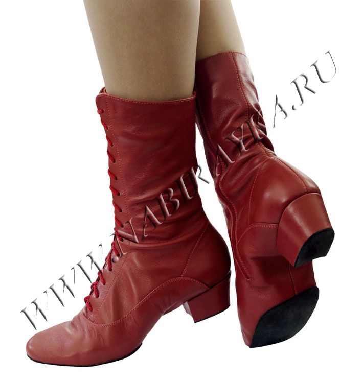 Боты кадрильные для народно-характерных танцев. Выполнены из натуральной кожи с молнией сбоку и изящной шнуровкой. Высота бот по заднему шву голенища от пятки 19-20 см. Подклад х/б и натуральная кожа. Подошва раздельная, мягкая натуральная кожа (спилок). Каблук обтяжной 3,5 см.
